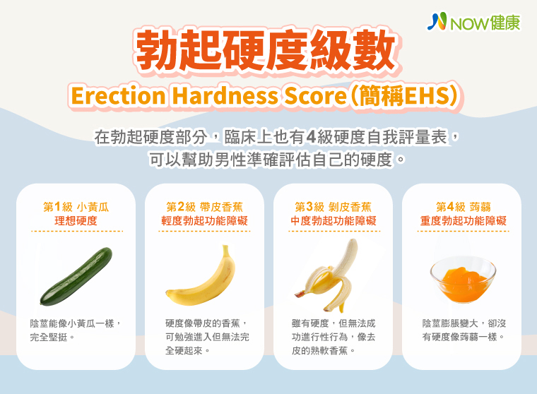 陳煜醫師進一步指出,在勃起硬度部分,臨床上也有4級硬度自我評量表,可以幫助男性準確評估自己的硬度。從第1級理想硬度的小黃瓜,到第2級輕度勃起功能障礙的帶皮香焦,甚至第3級中度勃起功能障礙的剝皮香蕉,一直到第4級如蒟蒻般的重度勃起功能障礙。