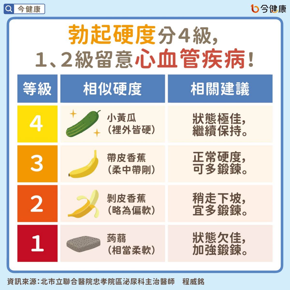 醫師表示,第四級可謂男人的最佳狀態,第三級帶皮香蕉是一般男性應有的硬度,剝皮香蕉則有陽痿的傾向,蒟蒻則為陽痿,後兩者皆得留意原因以及心血管疾病的風險。