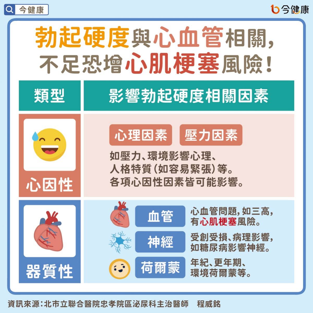 程威銘醫師表示,勃起硬度不夠、陽痿主要可分成心因性及器質性兩種,心因性也就是多與心理因素有關,例如壓力、環境等影響。發生時機往往來得突然且年輕,時好時壞,也會隨著年紀每下愈況。值得注意的是,心因性也和人格特質息息相關,患者多較為敏感、容易緊張,因此醫師也提醒,需改善的不單只有勃起的硬度,也需思考如何面對人生處事的課題。