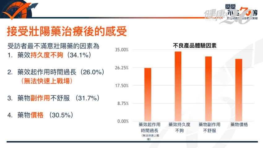 而在調查中發現讓陽萎男性放棄治療的重要關鍵是:抱怨勃起持久度不夠的佔第1位,有38.5%,其次則是抱怨「藥效起作用時間過長」,有34.1%的受訪男性抱怨用藥後無法快速上戰場。