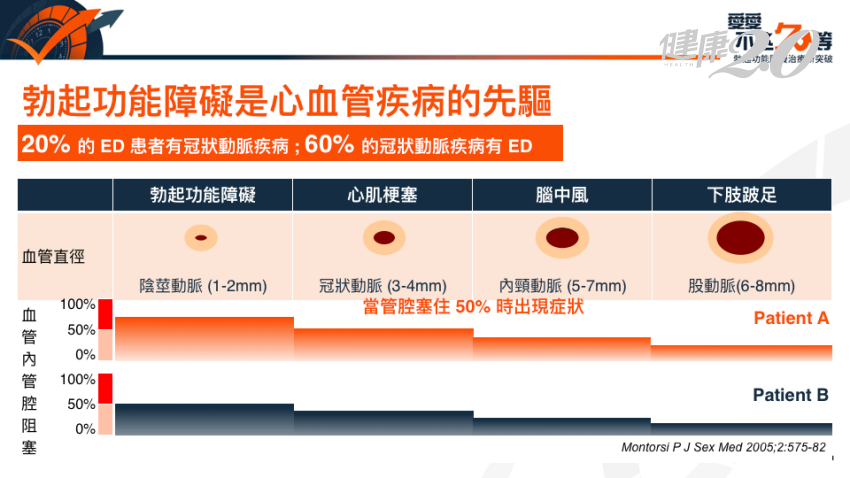陳煜表示,其實性功能比想像中更容易發生障礙,因為勃起功能障礙主要是陰莖動脈血管阻塞。而陰莖的動脈血管很細,只要有高血壓或是糖尿病,血管有發生硬化或狹窄的時候,陰莖動脈血管會比心血管更快發生狹窄。只要它阻塞達50%,就會出現勃起問題。而陰莖有50%阻塞,此時冠狀動脈恐怕已有30%阻塞,所以一旦發生勃起功能障礙,不但要擔心「小頭」出問題,更要趕快去檢查心血管是否健康。