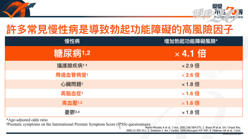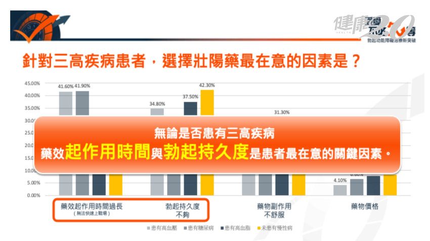 陳煜提醒,勃起功能障礙多和血管功能異常有關,肥胖、有三高等代謝性症候群男性,會較早出現不舉或性行為時陰莖變軟等功能障礙。有糖尿病的人,性功能障礙風險提高4.1倍、有周邊血管疾病問題者,性功能障礙風險提高2.6倍、憂鬱症患者性功能障礙風險也提高1.8倍。所以很多治療不舉的男性可能都需要服用治療慢性病藥物,更需要更安全、不易和藥物產生交互作用的壯陽藥。